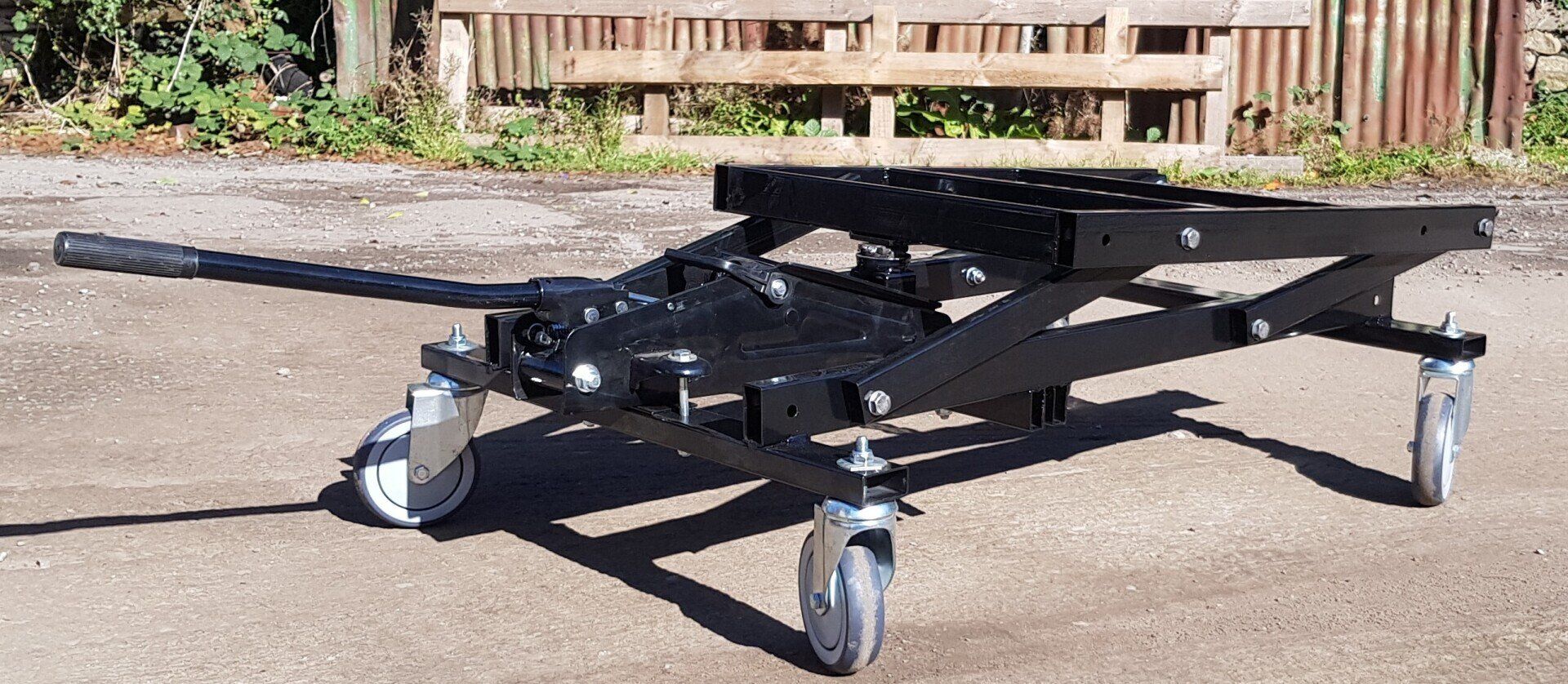 The trolley is made from heavy duty box section steel with a two Tonne Hydraulic Bottle Jack (Handle Supplied) with rubber swiveled wheels making it easy to move around, protecting your floors & carpets.